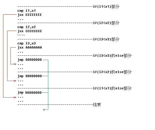 这里我们看到在Debug版里,多层嵌套if-else只是简单重复单层if-else的结构。另外,jxx仍然是false则跳转,翻译为if时,要注意。