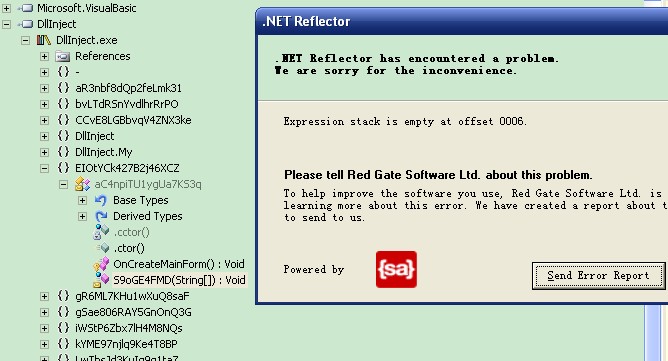 用Reflector无法正常载入,看来文件还被特意修改过啊,解决方法:http://hi.baidu.com/dreamzgj/blog/item/3c0bc18e243592f0513d928a.html。不过马上又出现了新的错误:Reflector Error:Module '…' contains zero or multiple module definitions。解决方法:http://hi.baidu.com/dreamzgj/blog/item/5cd5f1456fedc388b2b7dc8a.html。都是同一个人写的文章。这回Reflector载入虽然还是提示数组越界的错误(看来还有其他被修改的小地方),名称也都被混淆过(另外用StrongNameRemove根本不能正常载入该程序),但起码可以看个大致结构了,entrypoint函数(S9oGE4FMD)还是无法显示。