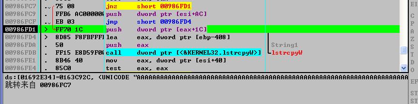 00402E82 处步过的时候程序异常了,重新来过,这次在这里F7,进去0x00986F8B,上下打量一翻,一个“可爱”的函数映入了眼帘:lstrcpyW,接下来的分析验证就简单了,经过确认,事故责任人就是它….