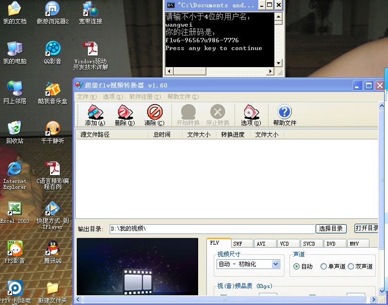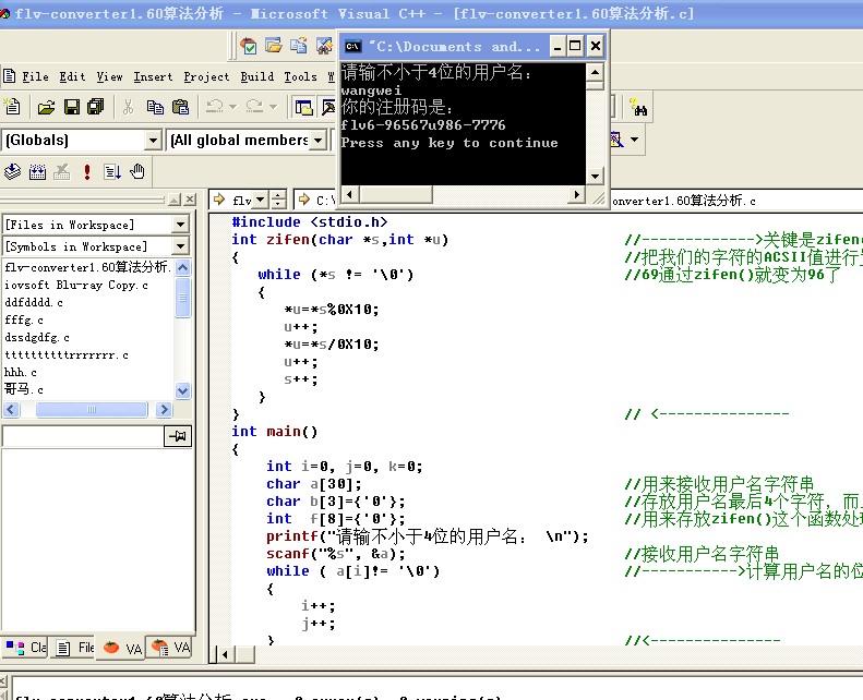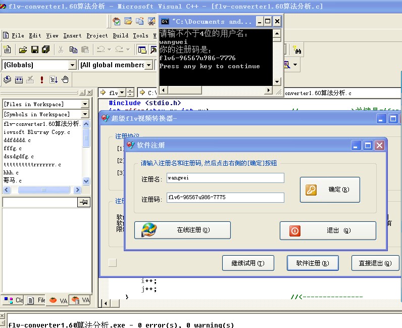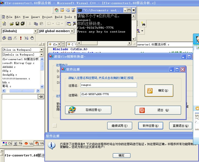 (1).第一个用户名是wangwei 转化为16进制数是77616E67776569倒过就是 96567776E61677得到注册码就flv6-96567u986-7776