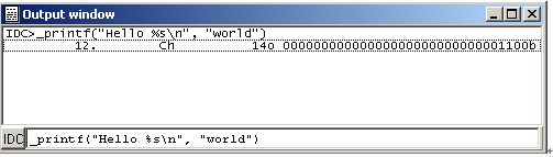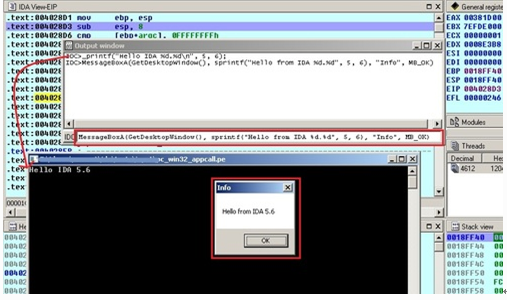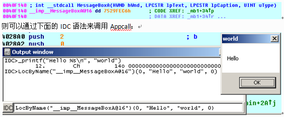 上面的截图显示了如何使用IDC语法调用了三个函数:printf,MessageBoxA和GetDesktopWindow。