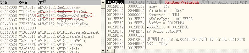 00410ED5 |. FF15 0C804400 CALL DWORD PTR DS:[<&ADVAPI32.RegOpenKeyExA>] ; \RegOpenKeyExA 00410EDB |. 3BC3 CMP EAX,EBX 00410EDD |. 0F85 13010000 JNZ MV_Build.00410FF6 00410EE3 |. 8B7424 14 MOV ESI,DWORD PTR SS:[ESP+14] 00410EE7 |. 8D4C24 14 LEA ECX,DWORD PTR SS:[ESP+14] 00410EEB |. 51 PUSH ECX 00410EEC |. 8D5424 28 LEA EDX,DWORD PTR SS:[ESP+28] 00410EF0 |. 52 PUSH EDX 00410EF1 |. 68 64BB4400 PUSH MV_Build.0044BB64 ; ASCII "Key"