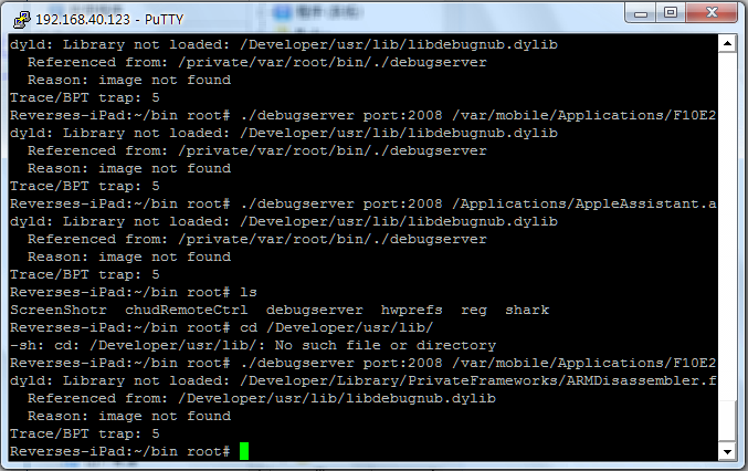 提示文件没有找到,但是如果设备曾经链接过xcode进行过程序调试则不会出现下面的情况。这是因为xcode在进行程序调试的时候会将所需要的文件拷贝到Develop目录下,这样的话不论gdbserver在哪个目录下程序都是可以正常执行的。同样在上面的命令中看到的debugserver是苹果自己编译的一个gdbserver调试服务器,而实际使用则基本是没有任何的差异和影响的。