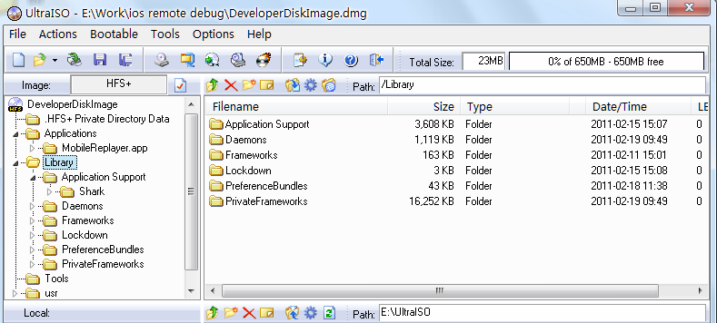 在实际的调试过程中只需要选择相应的版本就可以了。在每个目录下都存在一个DeveloperDiskImage.dmg文件,用ultraiso打开这个文件可以看到如图3的文件目录列表: