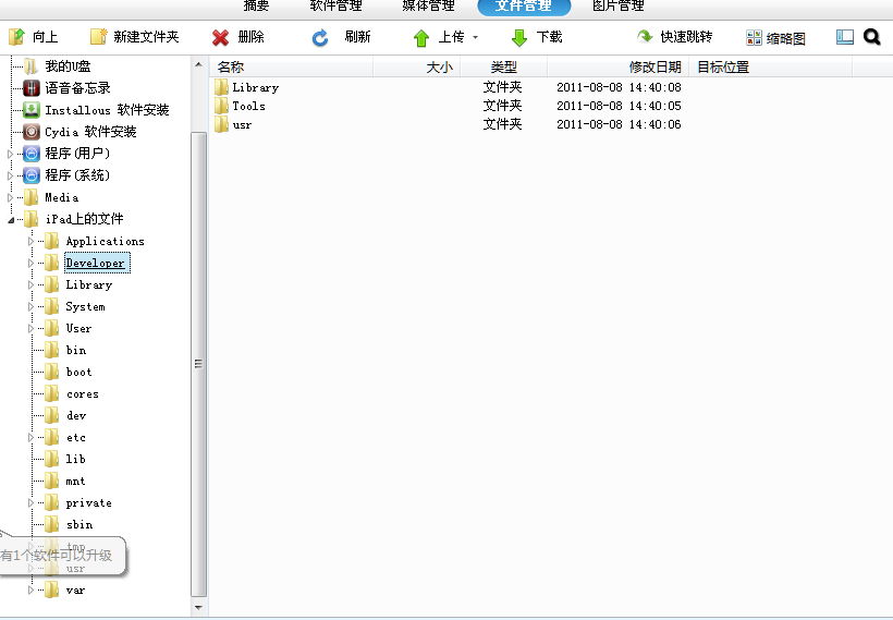 在调试的过程中需要将整个dmg文件下的所有目录和文件拷贝到设备上的/Developer目录下,如图4所示。这一步可以使用ios的文件管理工具,或者使用winscp上传文件,不建议使用后者,太卡了~,如果使用过xcode开发调试过程序那么这个目录下的所有东西应该都是存在的,可以无需手工复制。