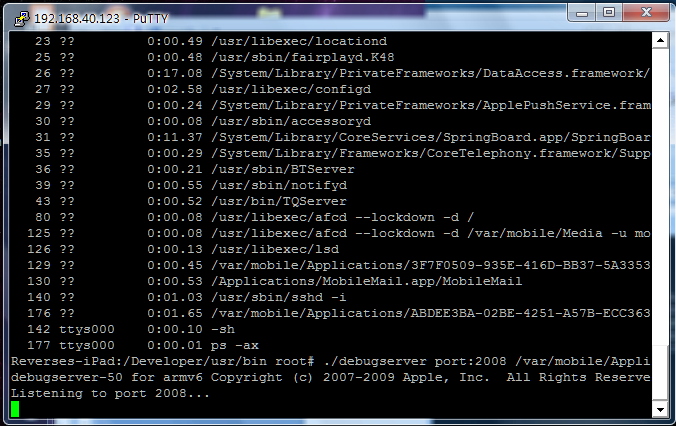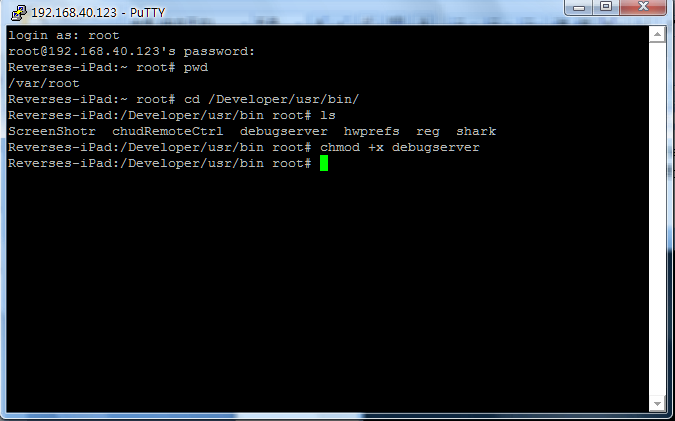 在这里的调试可以使用预先分析文件和直接attach的方式进行调试。直接attach的方式比较简单一些,使用ssh客户端连接到设备(需要无线网络支持,如果木有,那我也办法哦~),在win下可以使用putty。