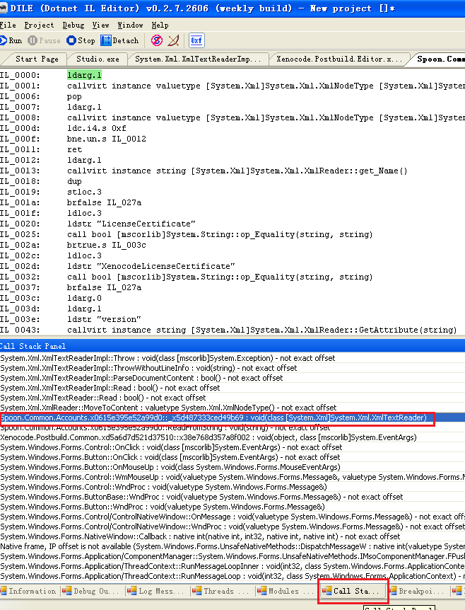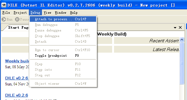 首先出场的是初级DOTNET调试软件DILE。先运行Spoon,然后使用DILE的Attach功能来附加到Spoon的进程上。