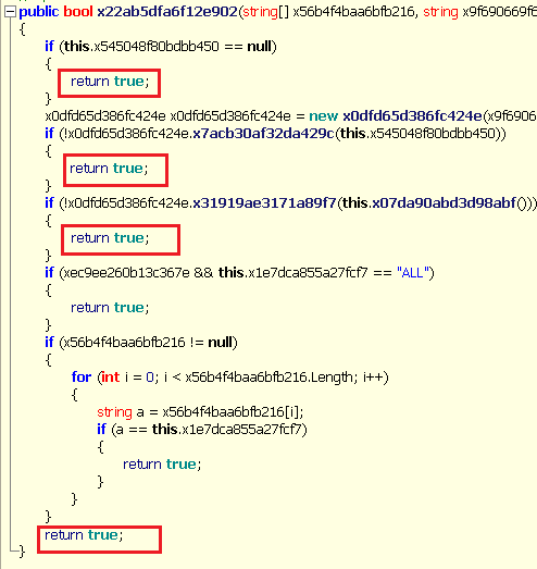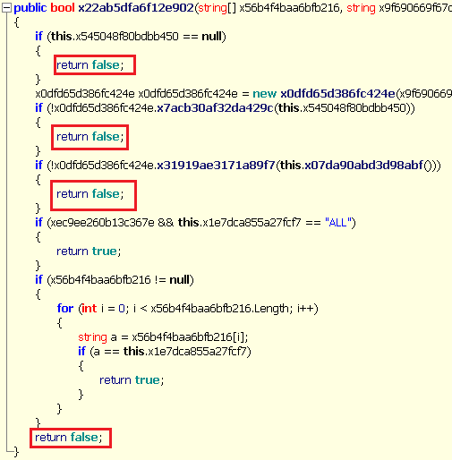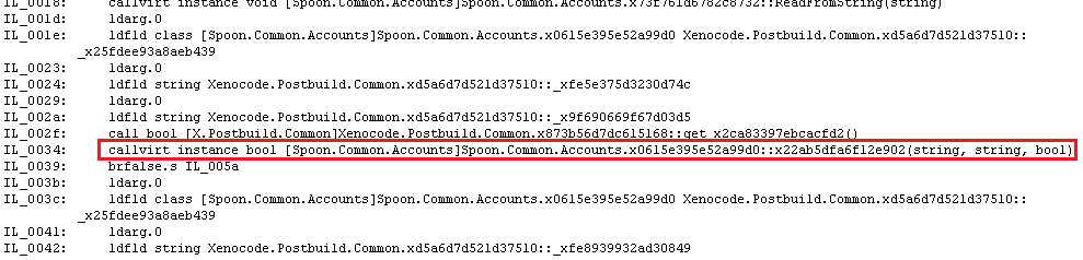 这个时候ILSPY上场了,找到Spoon.Common.Accounts.dll的类x0615e395e52a99d0和方法x22ab5dfa6f12e902名,发现这个方法是有一个重载,如下图所示只要将这个方法的返回值全部设置为true就可以了。