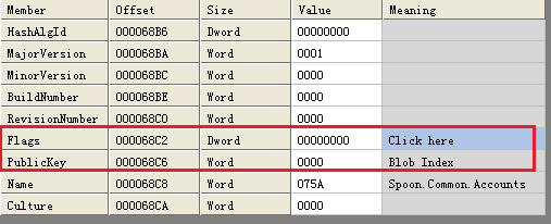 打开CFF Explorer,将Spoon.Common.Accounts.dll文件拖入到该工具中,首先找到强名的相关表,发现居然没有强名验证,这样我们破解就更简单了。