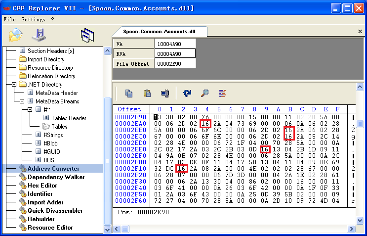 在Address Converter中输入前面我们找到的RVA地址0x4a90,我们就快就可以定位Hex地址了。只要在这一段二进制中将返回值设置为true就行了,经常玩DOTNET破解的就应该知道只需要将二进制16修改为17就行了。我们找到这段IL代码中的五个16,然后全部修改为17后保存即可。