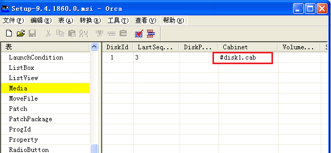 在左侧找到Media,在右侧记下流文件名叫做#disk1.cab,这个压缩包将在第2步用到。