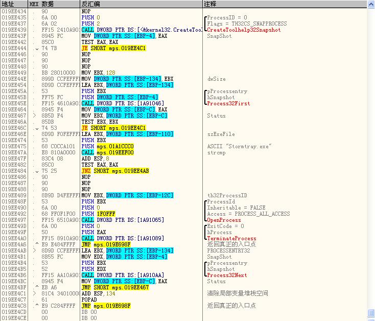 这样就可以用call [00141024]调用CreateToolhelp32Snapshot函数。Strcmp直接从c反汇编代码copy下就可以使用了。
