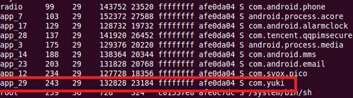 1. 首先在模拟器中启动apk,在命令行下输入 adb shell ps,找到相应的进程pid,在这个例子中pid是243