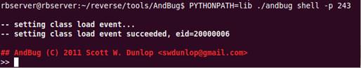 2. 进入AndBug目录,输入PYTHONPATH=lib ./andbug shell –p 243,不出意外的话就能attach上目标进程了