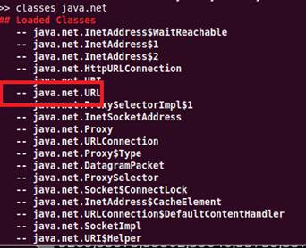 出现了一堆相关class,我们看到里面有java.net.URL,一般我们访问网络资源时,通常都会新建一个URL类,在这个类上下断点应该是合理的