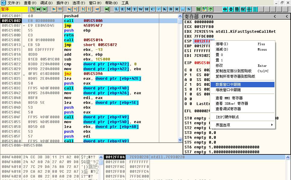其中Esp指向堆栈的栈顶,Eip指向下一条指令。