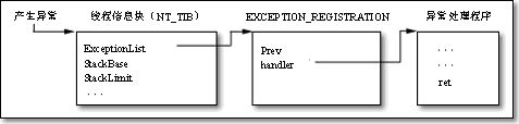 NT_TIB结构的第一个字段ExceptionList指向一个EXCEPTION_REGISTRATION结构,SEH异常处理回调函数的入口地址就是由EXCEPTION_REGISTRATION结构指定的,这个结构的定义如下: